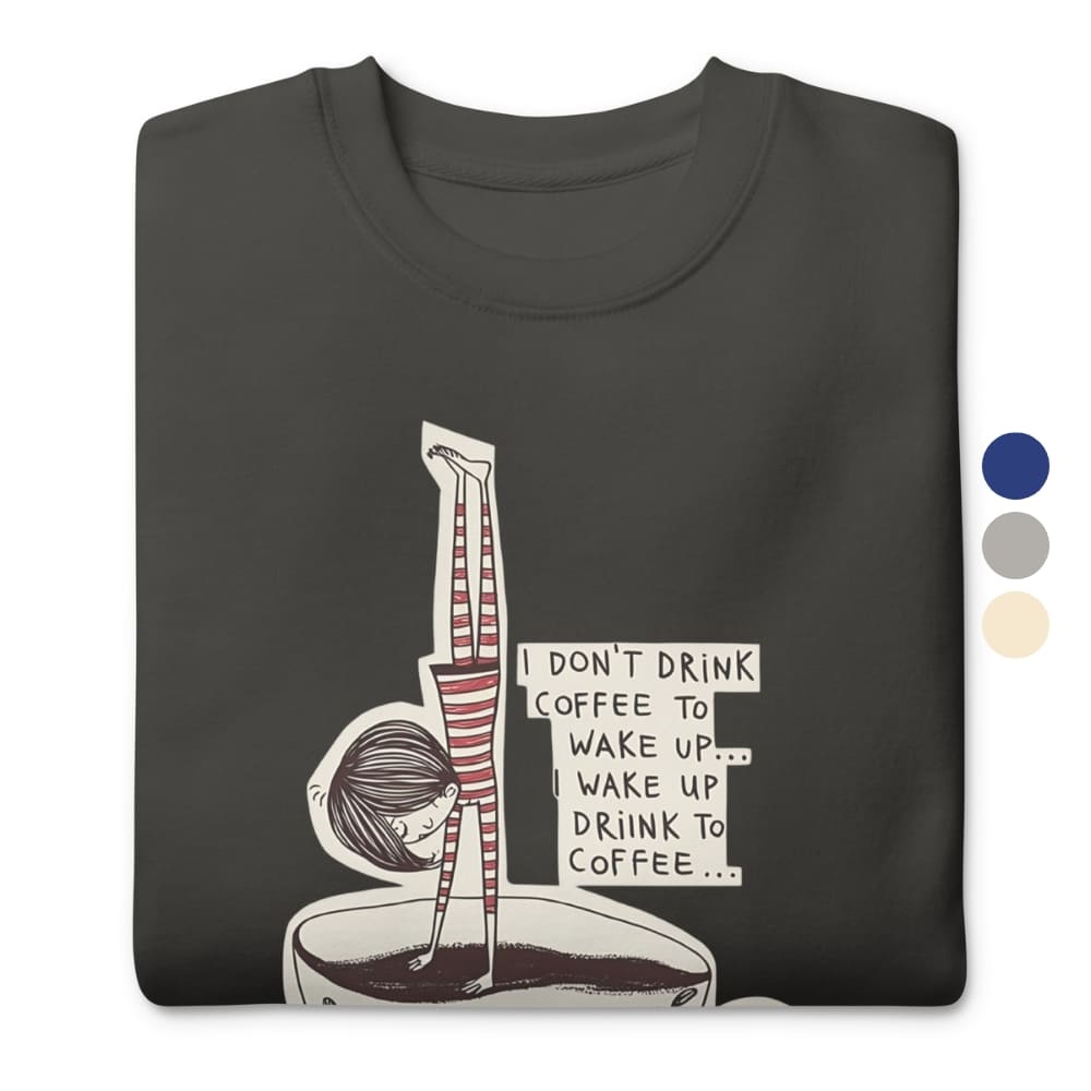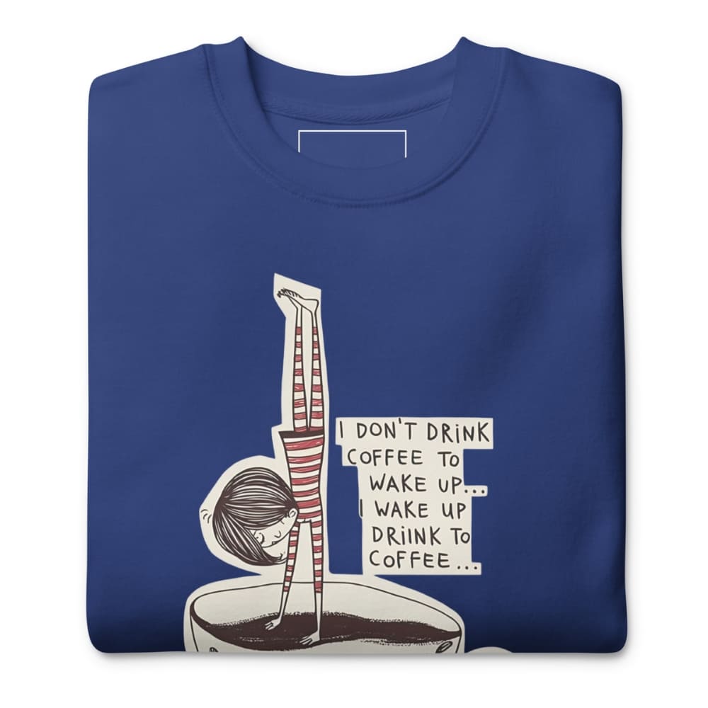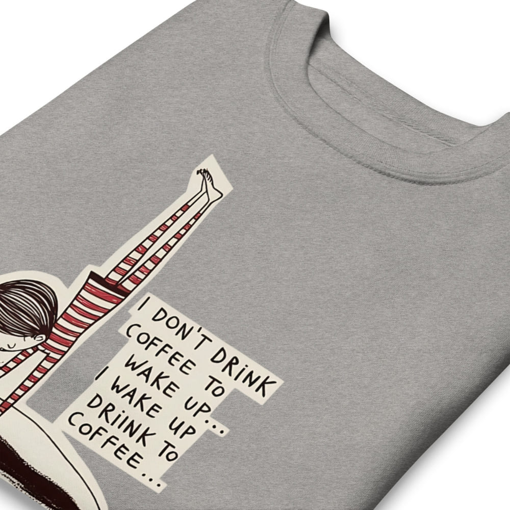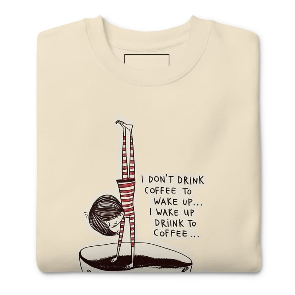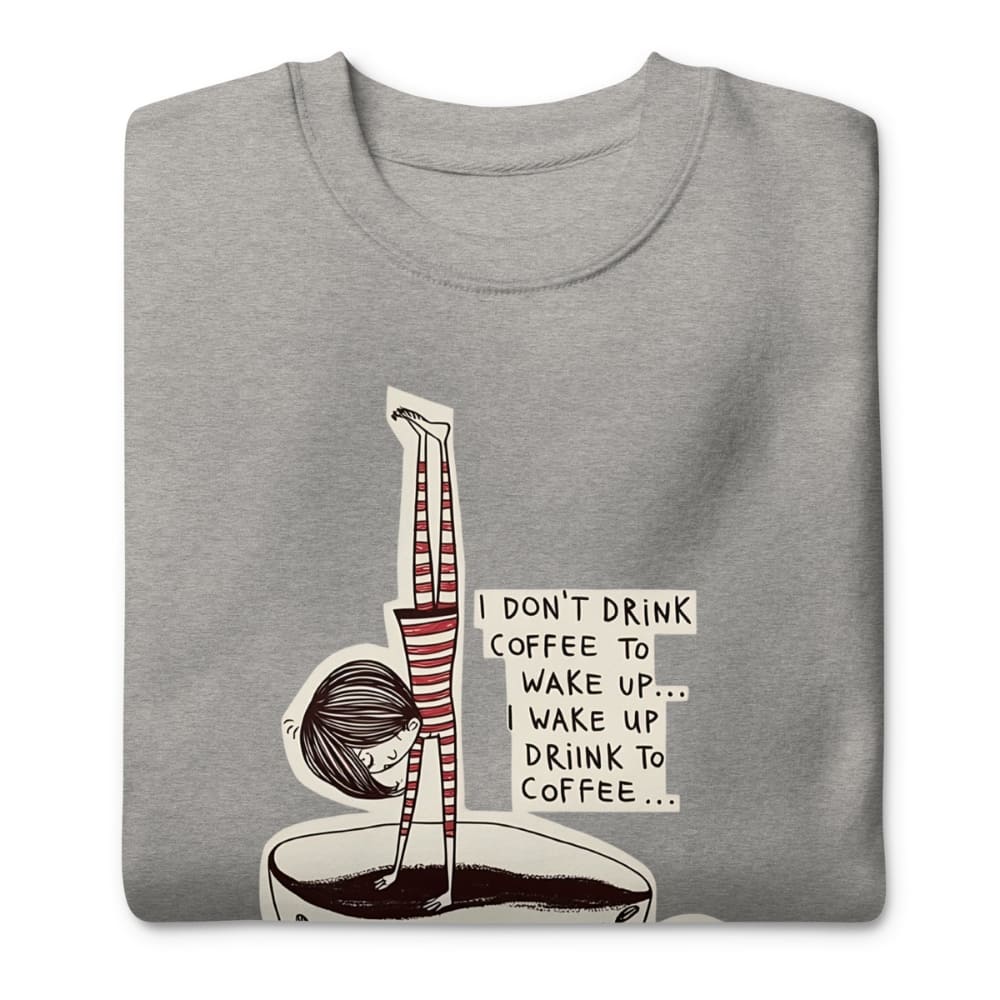 This ultra-soft premium fleece sweatshirt is made for cozy mornings, sleepy vibes, and caffeine cravings. Featuring a charming handstand girl diving into a giant coffee cup and the quote: