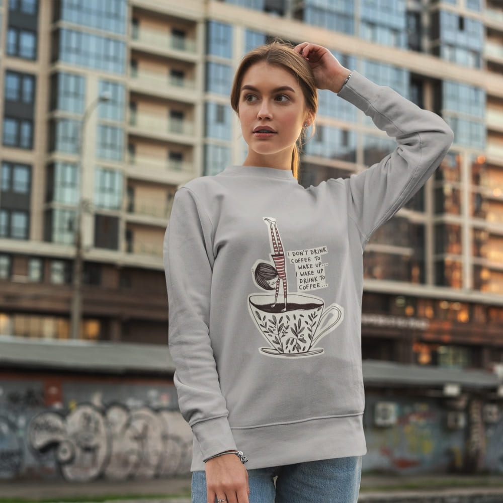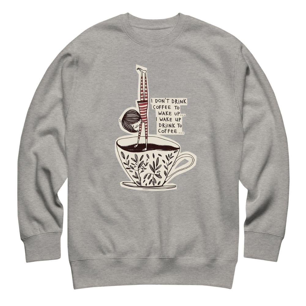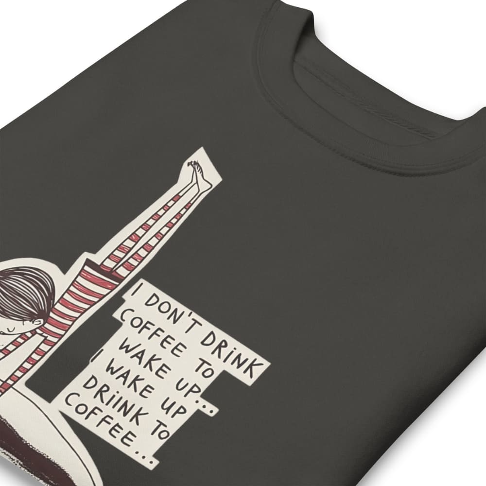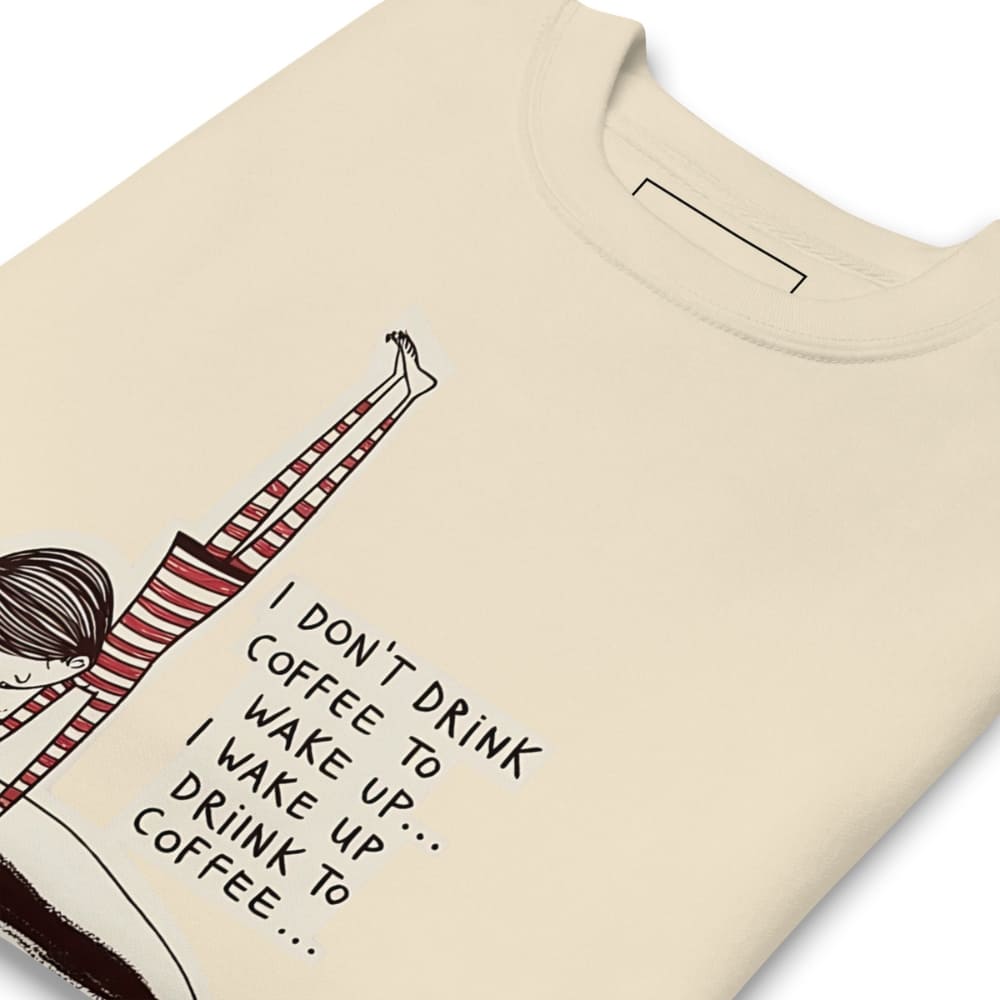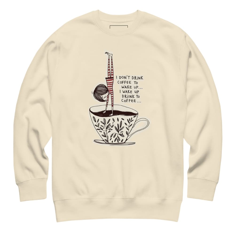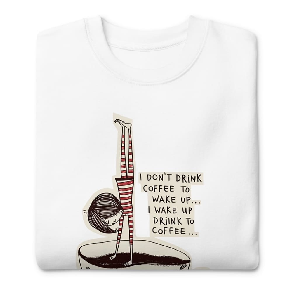 This ultra-soft premium fleece sweatshirt is made for cozy mornings, sleepy vibes, and caffeine cravings. Featuring a charming handstand girl diving into a giant coffee cup and the quote: