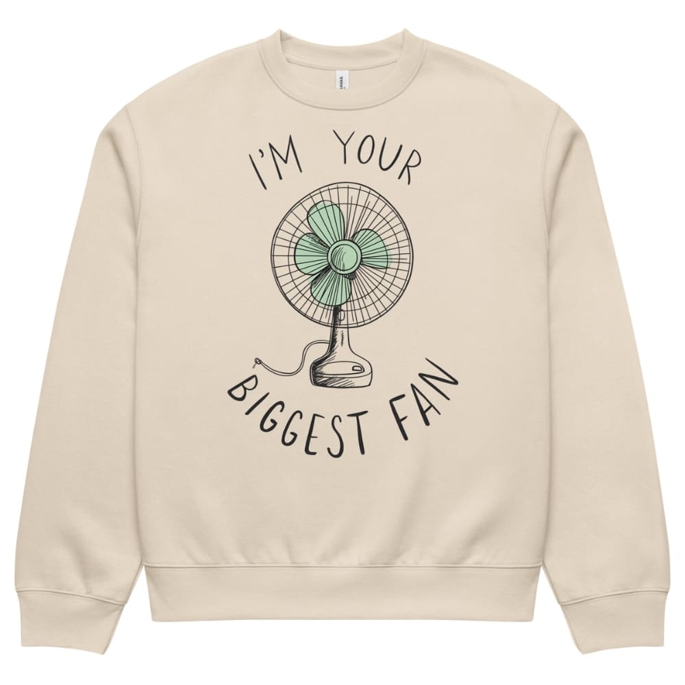This “I’m Your Biggest Fan” sweatshirt is a wearable pun with maximum charm. Featuring a hand-drawn vintage fan and playful typography, it's perfect for those who love lighthearted humor, quirky expressions, or just want to say “I got your back” — literally.