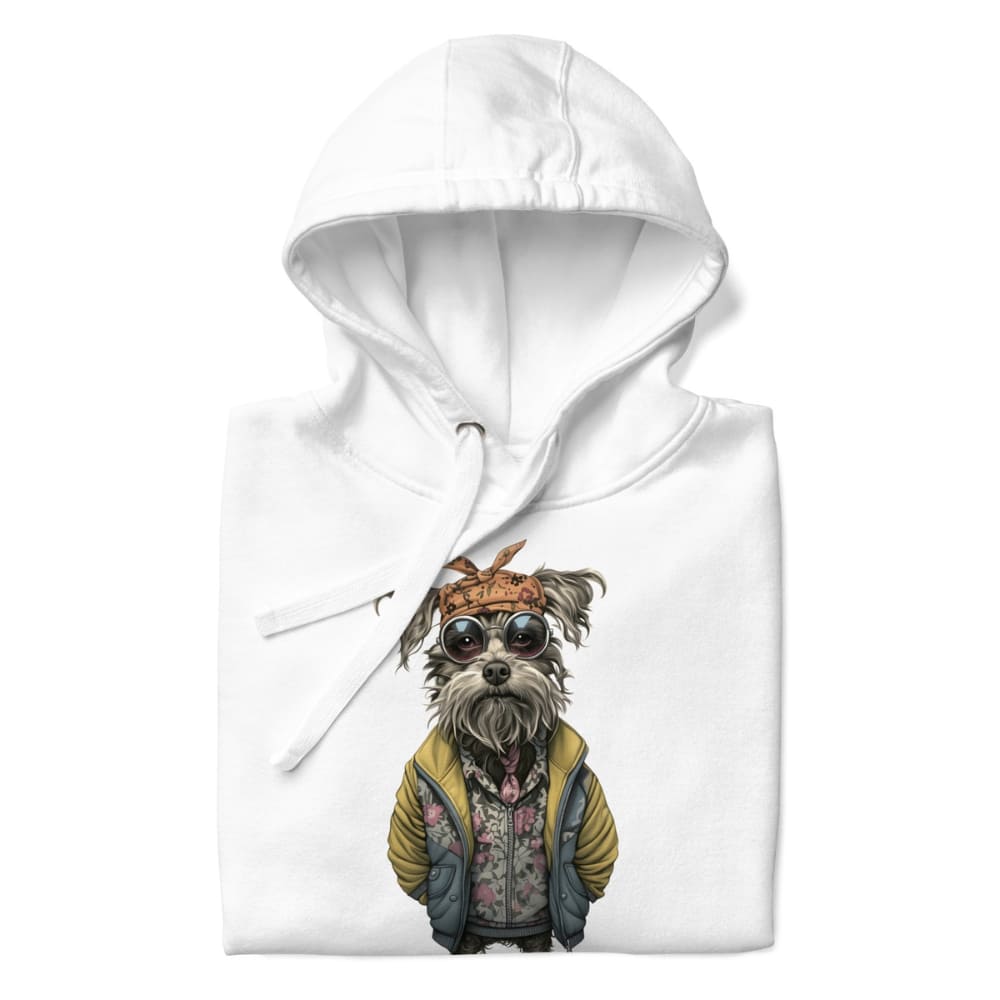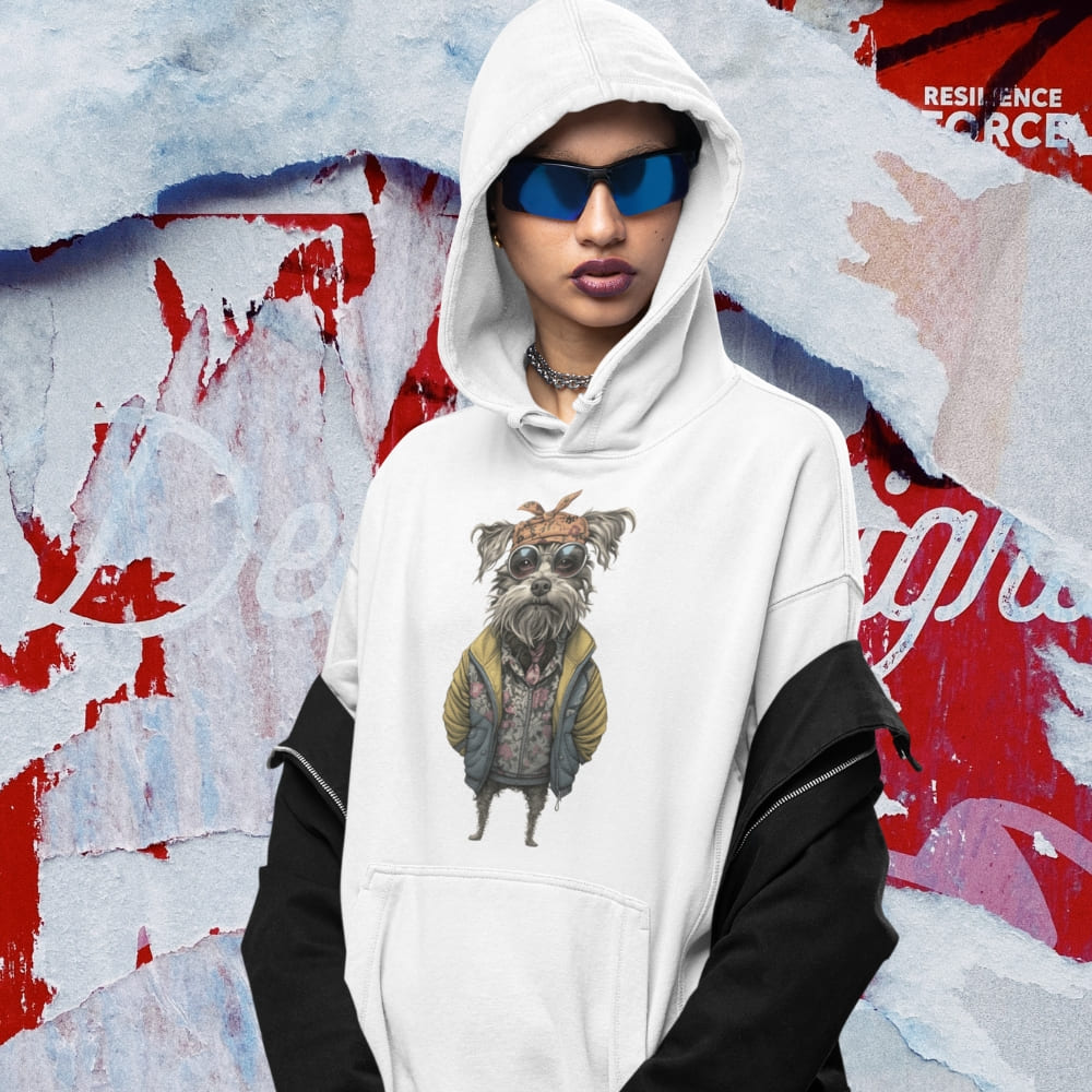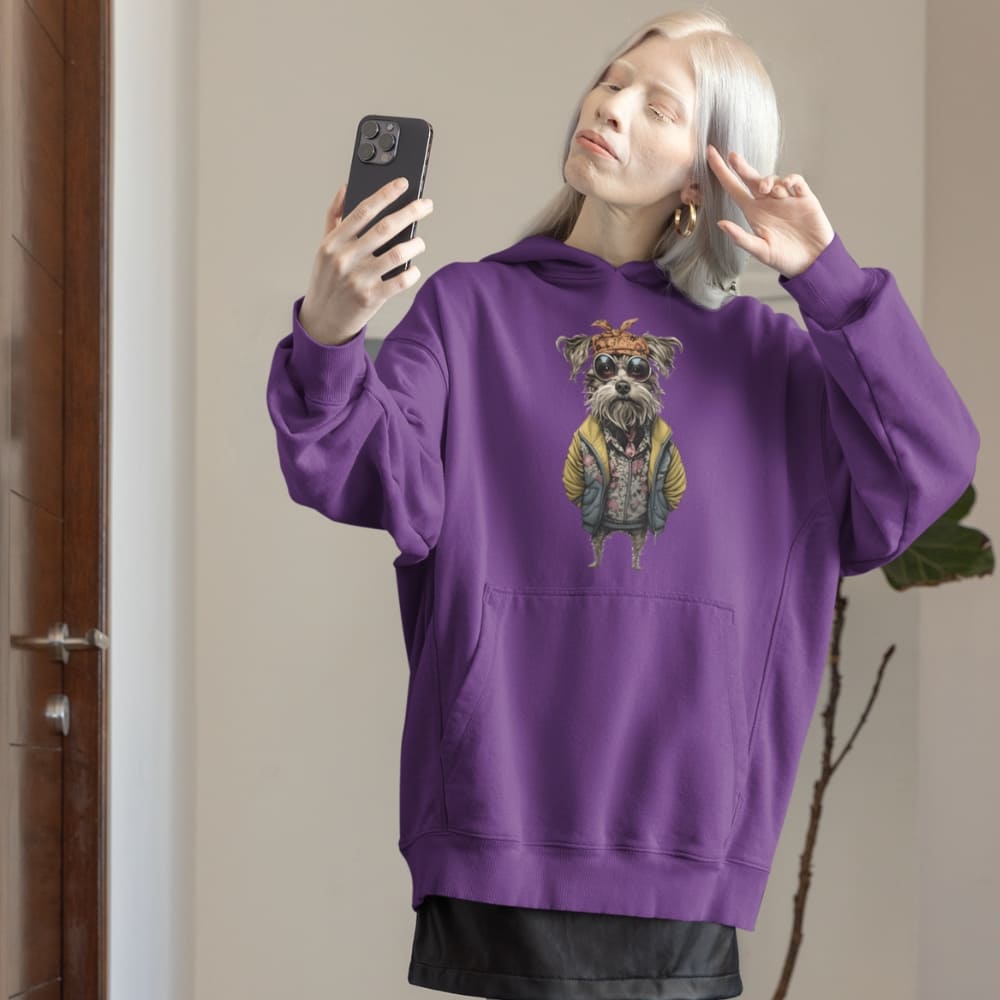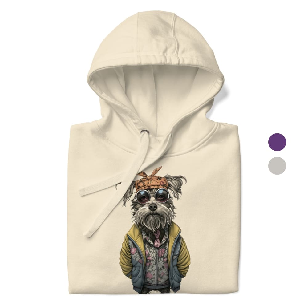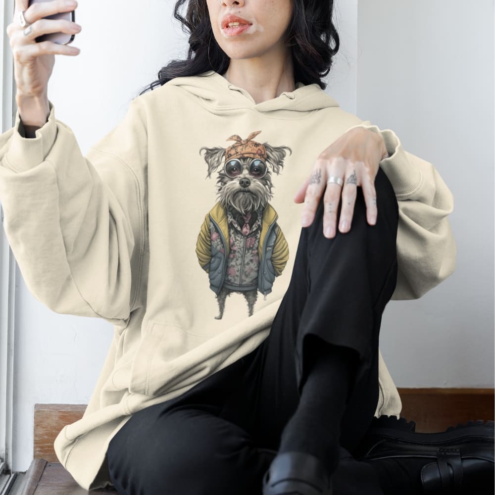 This Hipster Dog Hoodie is a fashion flex you didn’t know you needed. Featuring a seriously chill canine dressed in a floral zip-up, oversized yellow puffer jacket, retro round sunglasses, and a knotted bandana, this hoodie is pure graphic art with personality.