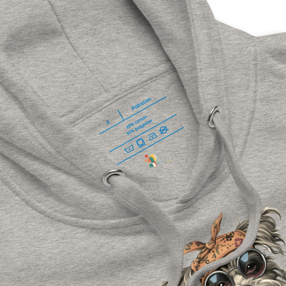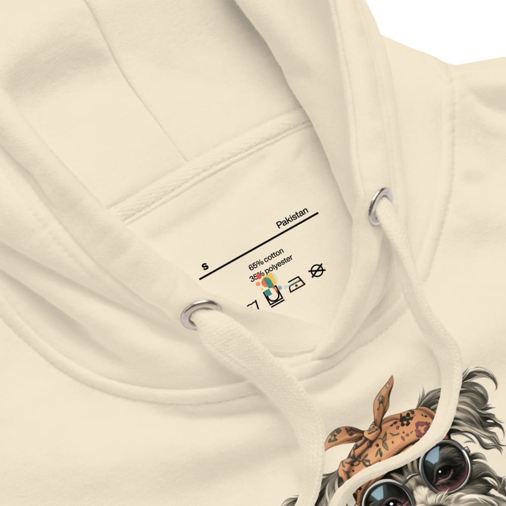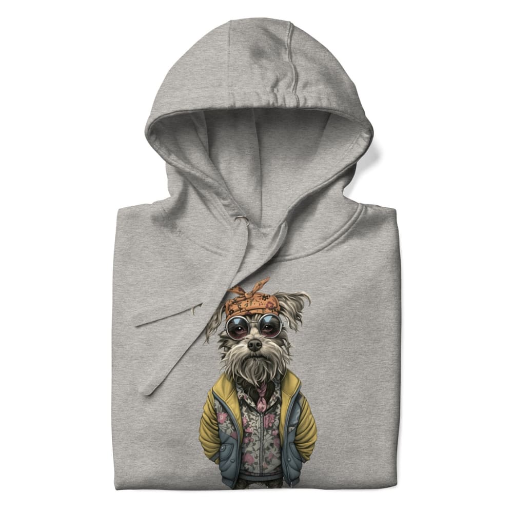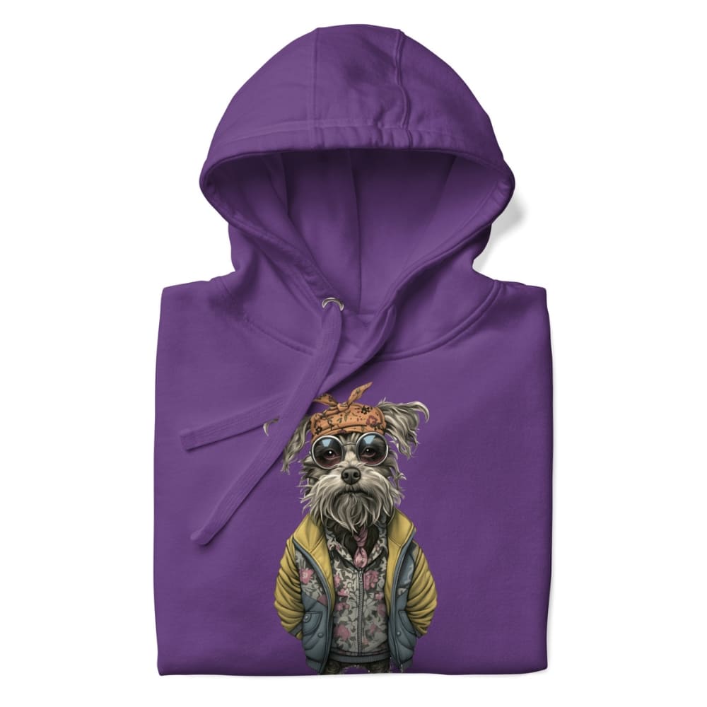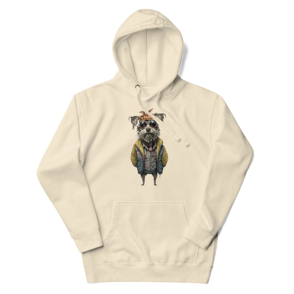 This Hipster Dog Hoodie is a fashion flex you didn’t know you needed. Featuring a seriously chill canine dressed in a floral zip-up, oversized yellow puffer jacket, retro round sunglasses, and a knotted bandana, this hoodie is pure graphic art with personality.