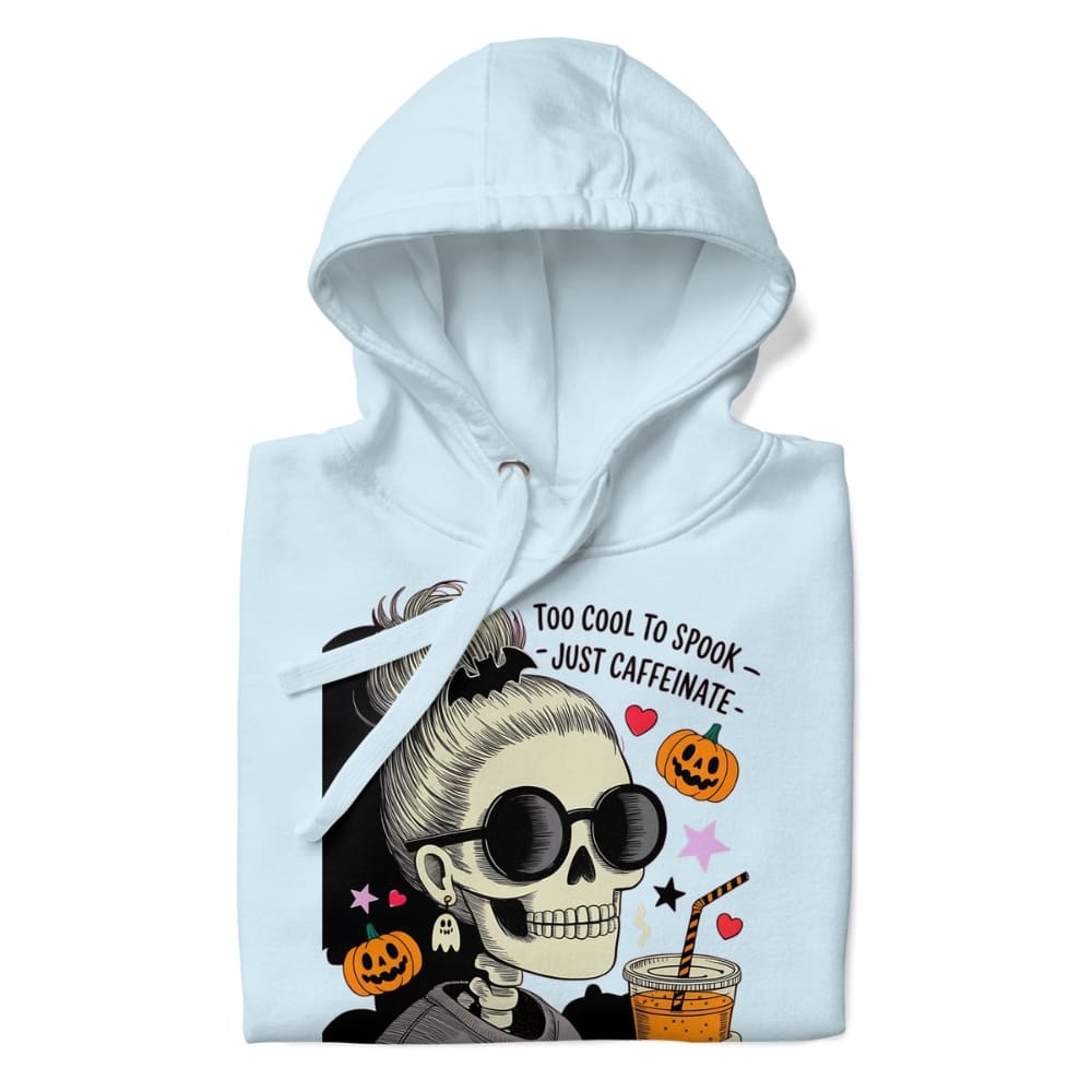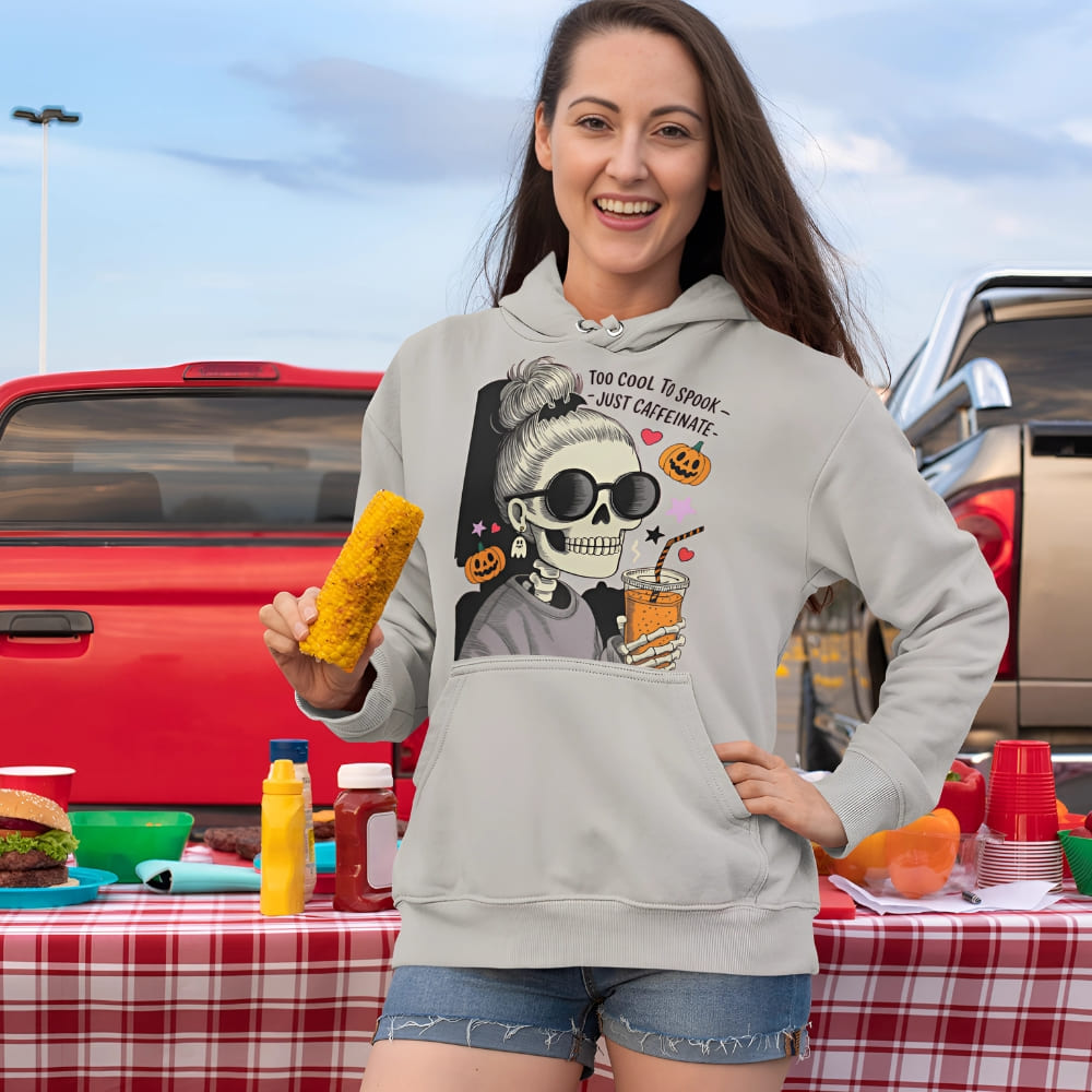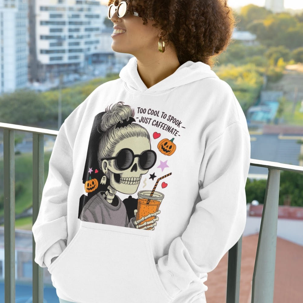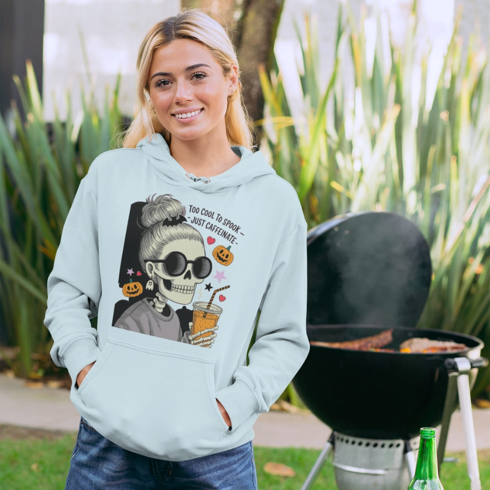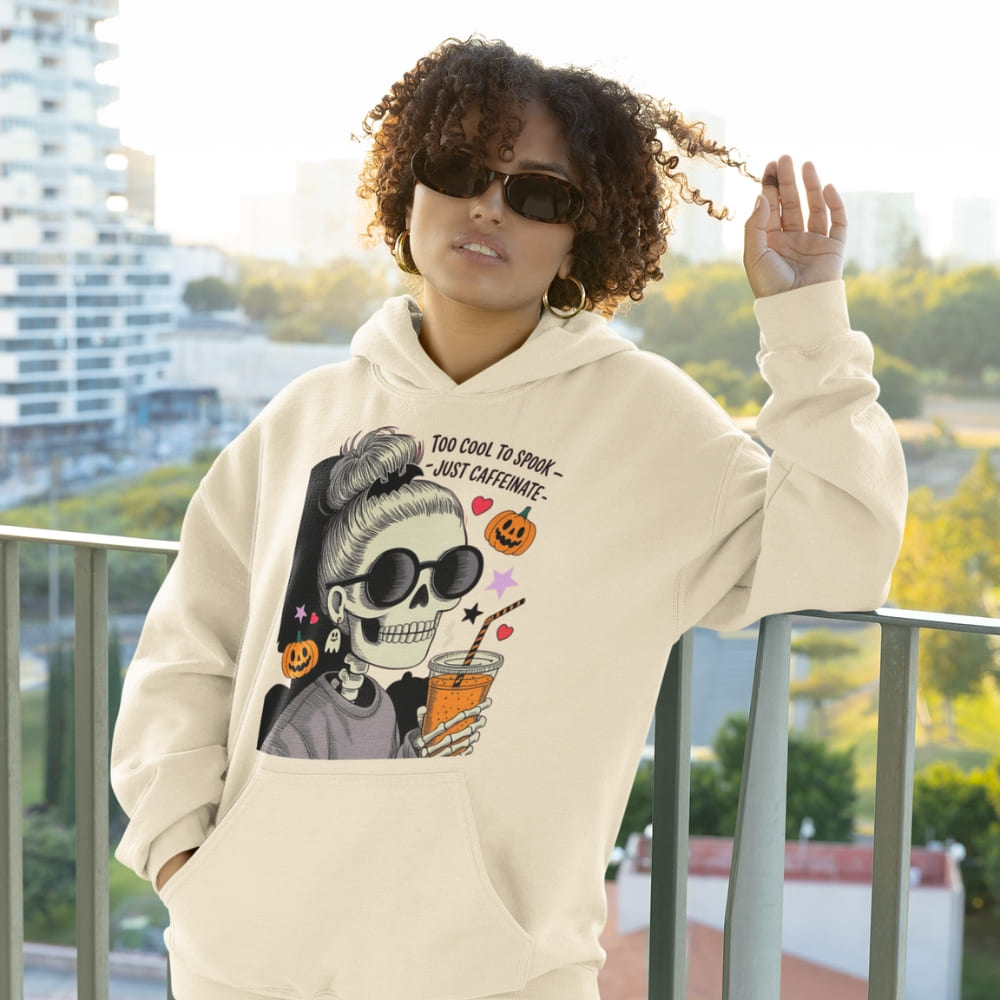 🎃 Halloween vibes meet coffee obsession in this limited-edition spooky-cute hoodie featuring a bun-wearing skeleton sipping iced coffee like a true October icon. With her ghost earrings, pumpkin backdrop, and bat hair clip, she’s ready for fall — just don’t interrupt until she’s caffeinated.