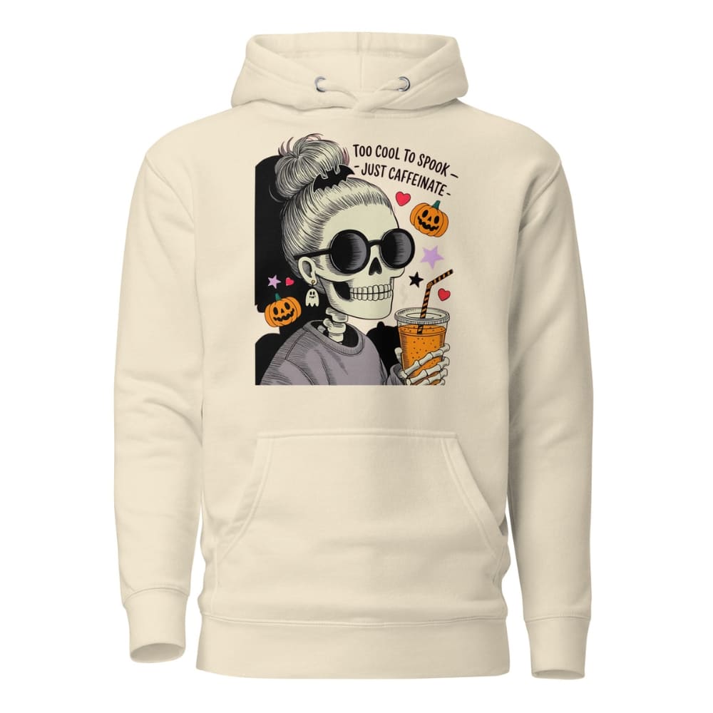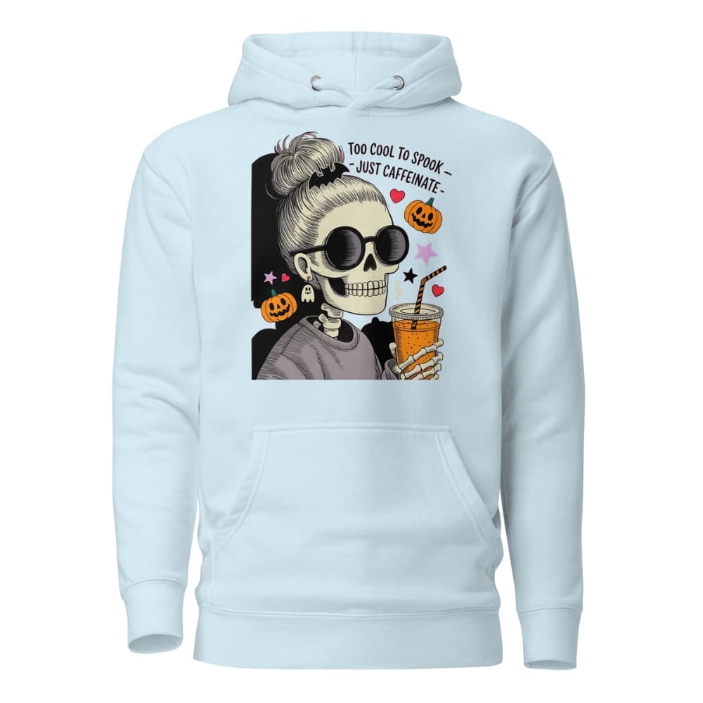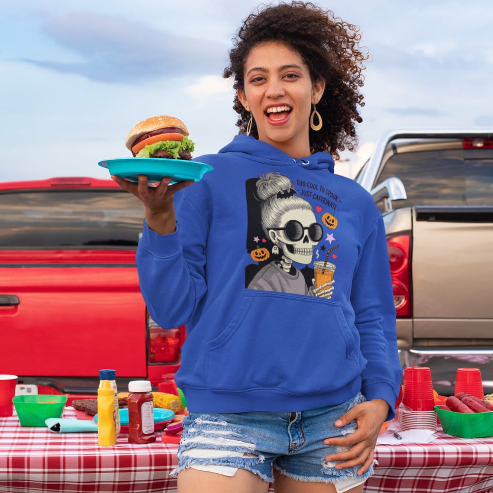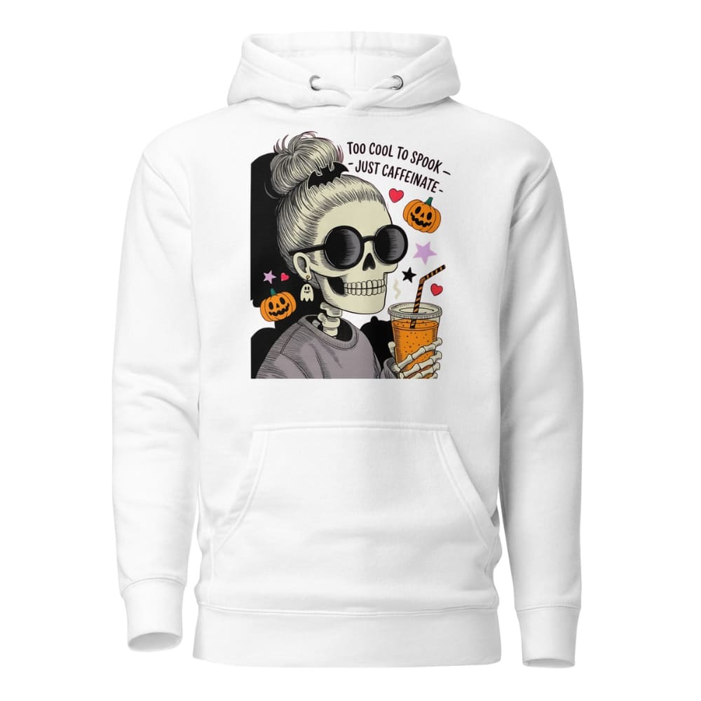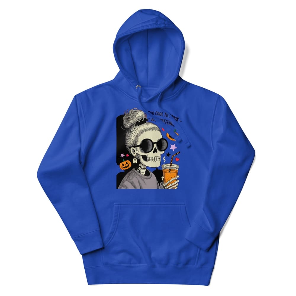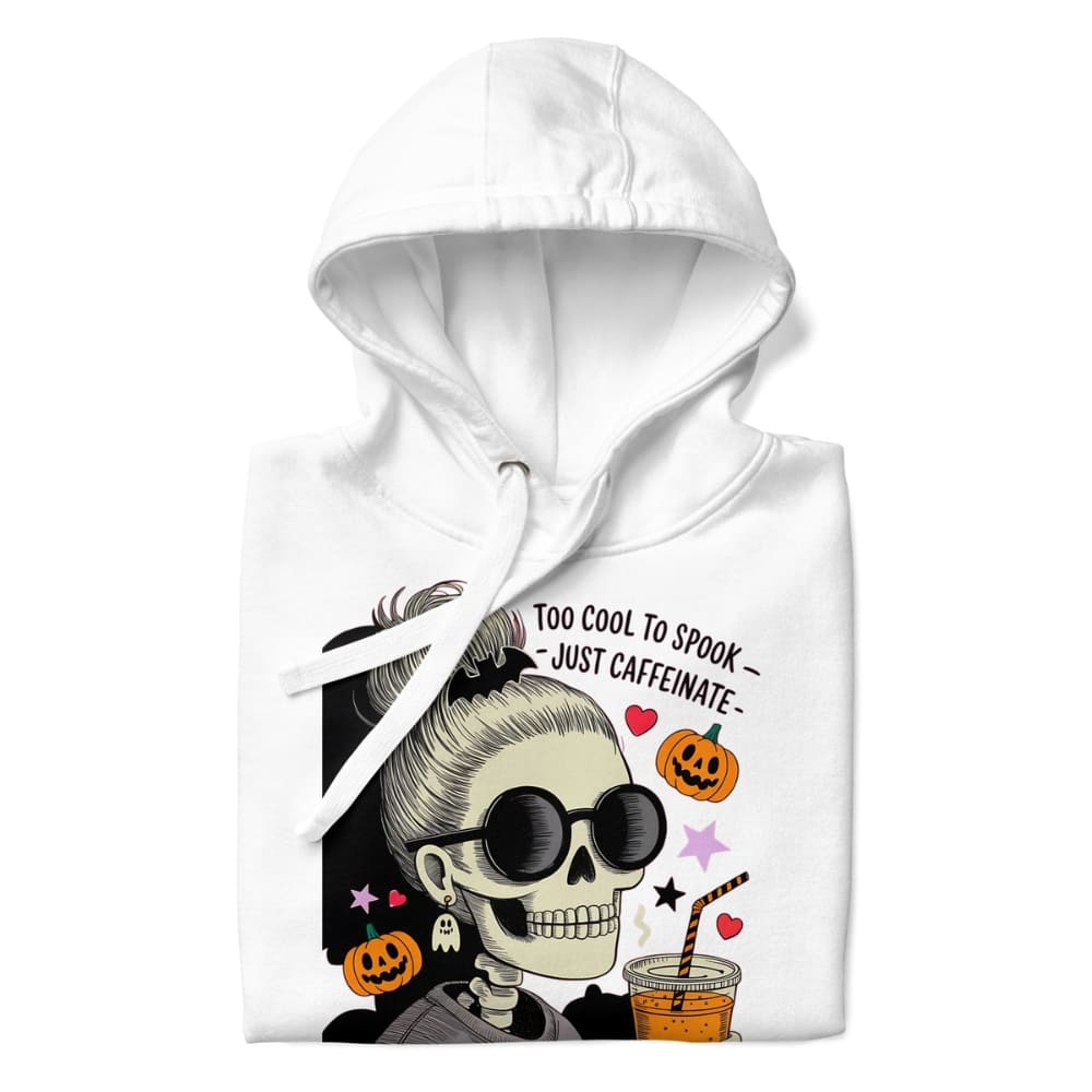 🎃 Halloween vibes meet coffee obsession in this limited-edition spooky-cute hoodie featuring a bun-wearing skeleton sipping iced coffee like a true October icon. With her ghost earrings, pumpkin backdrop, and bat hair clip, she’s ready for fall — just don’t interrupt until she’s caffeinated.