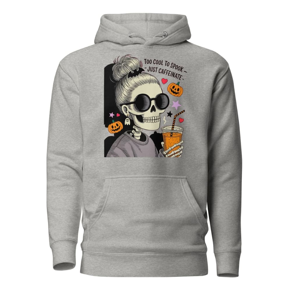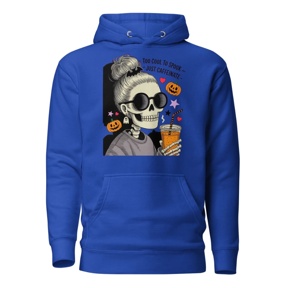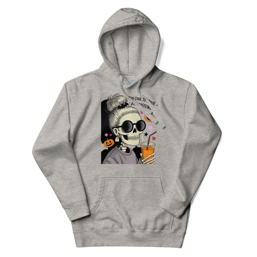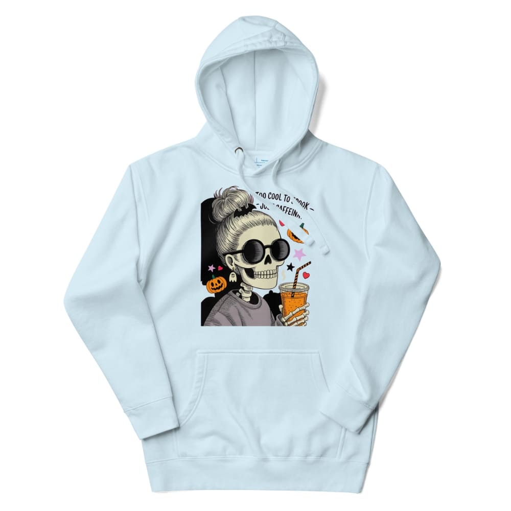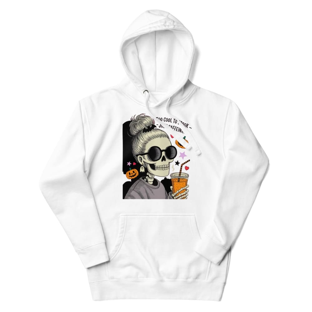🎃 Halloween vibes meet coffee obsession in this limited-edition spooky-cute hoodie featuring a bun-wearing skeleton sipping iced coffee like a true October icon. With her ghost earrings, pumpkin backdrop, and bat hair clip, she’s ready for fall — just don’t interrupt until she’s caffeinated.