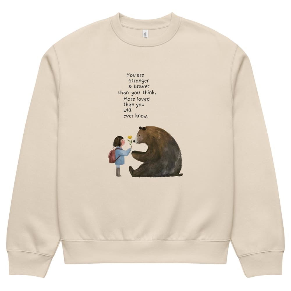Wrap yourself in warmth and encouragement. This oversized heavyweight sweatshirt features a heartwarming illustration of a little girl offering a flower to a bear — paired with the inspiring words “You are stronger & braver than you think. More loved than you will ever know.”
