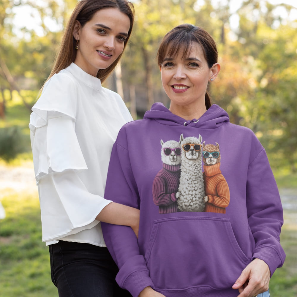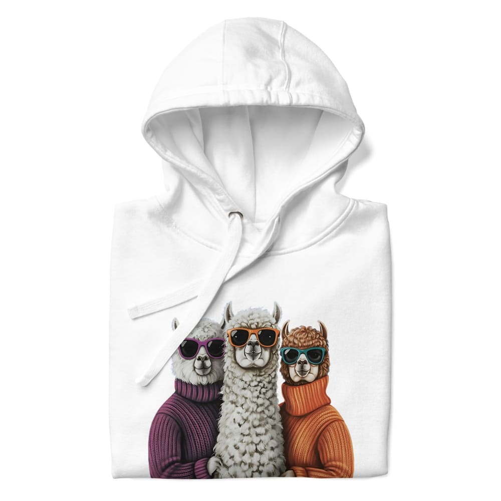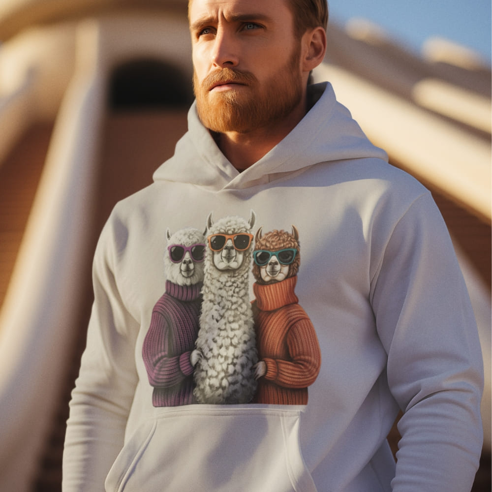 If you're a fan of clever animal art and cozy layers, this Cool Llamas in Sweaters Hoodie is made just for you. Featuring a hilarious graphic of llamas rocking bold sweaters and retro sunglasses, this design blends chill vibes with warm comfort.